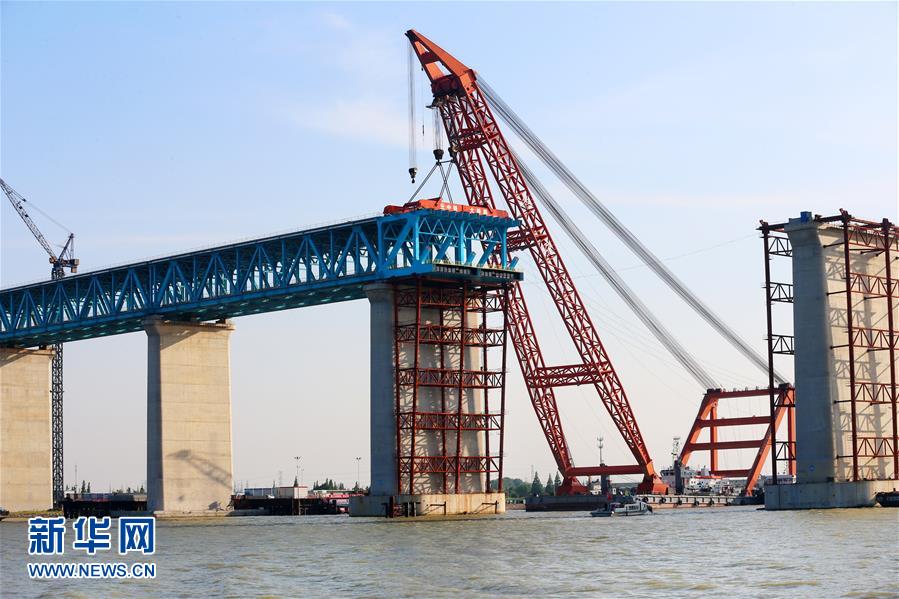 6月1日,重达1210吨的大节段钢梁被架设到沪通长江大桥主航道桥31号墩墩顶。新华社发(许丛军 摄)