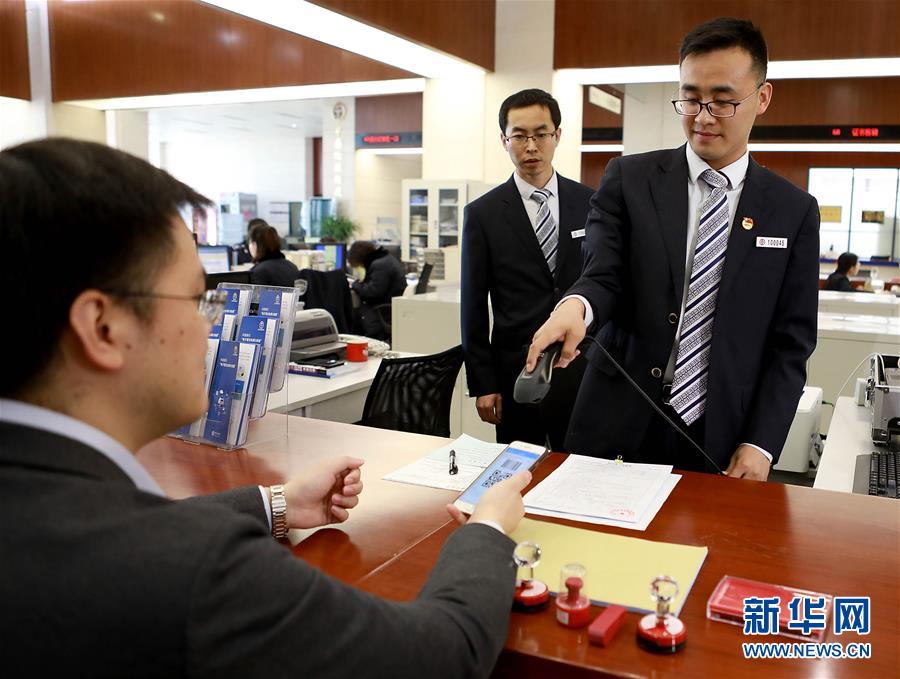 4月9日,中国国家市场监督管理总局推出的手机版电子营业执照在天津自贸试验区东疆片区首批发放。这是工作人员为天津花生好车汽贸有限公司董事长陈鹏云(左一)扫码登记。 新华社发