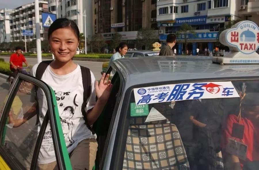 2002年7月7日,桂林五中的考生范艾芸走出考场乘坐高考免费服务车回家。(新华社记者 陈天湖 摄)