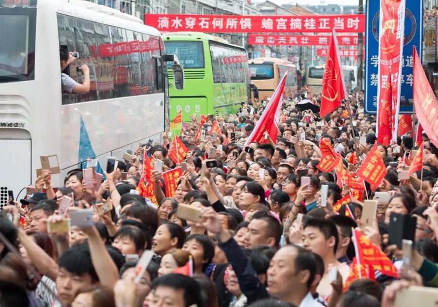 2017年6月5日,在六安市毛坦厂中学外,考生家长和当地居民为考生送行。(新华社记者 郭晨 摄)