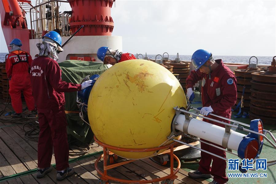 科考队员在安装潜标的主浮球(2017年12月4日摄)。新华社发