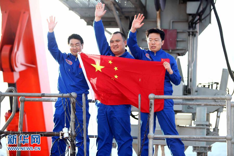 三位试航员走出“蛟龙”号载人潜水器后手举国旗挥手致意(2012年6月24日摄)。 新华社记者 罗沙 摄
