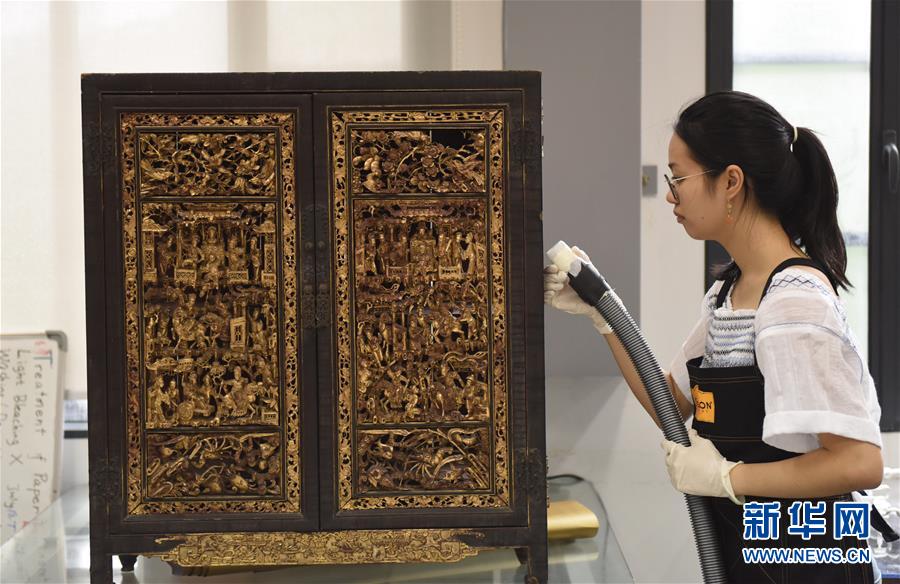 李梓荧在修复室里为一件修复中的潮州金漆木雕除尘(6月7日摄)。新华社记者 卢汉欣 摄