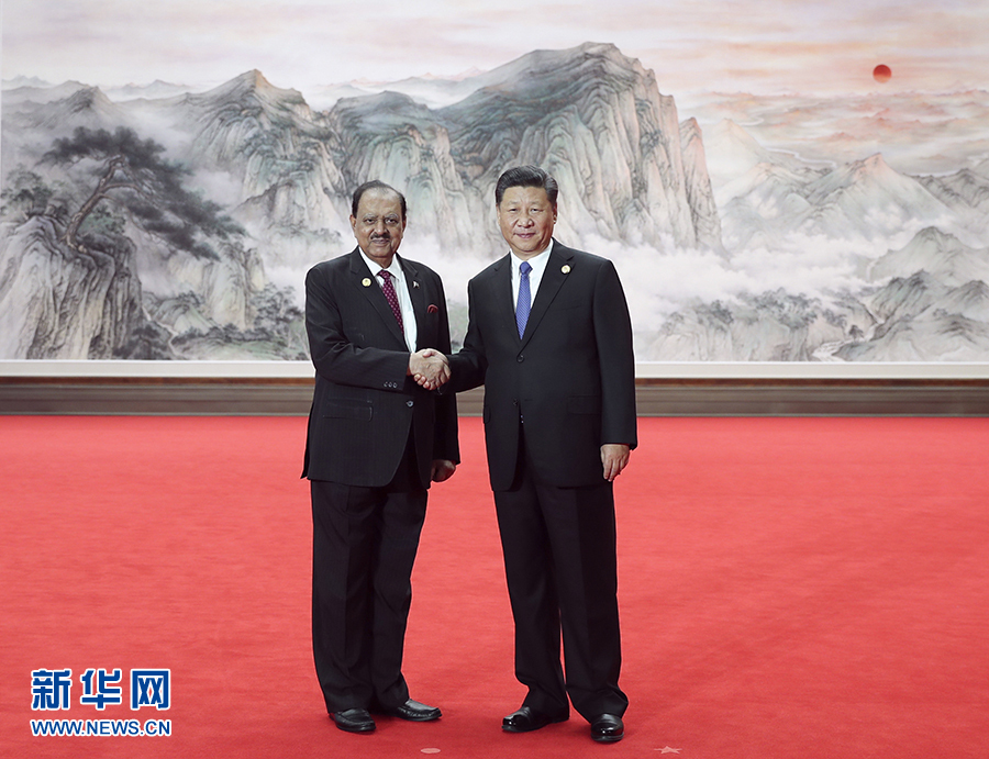 6月10日,上海合作组织成员国元首理事会第十八次会议在青岛国际会议中心举行。中国国家主席习近平主持会议并发表重要讲话。这是小范围会谈前,习近平在迎宾厅迎接巴基斯坦总统侯赛因。新华社记者谢环驰摄