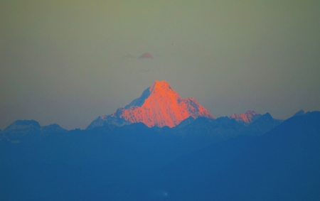 太阳渐渐冒出头,淡红色的光线洒下,远处,“高清版”的雪山开始一一亮相——幺妹峰、大雪塘、九顶群山、华西雨屏……