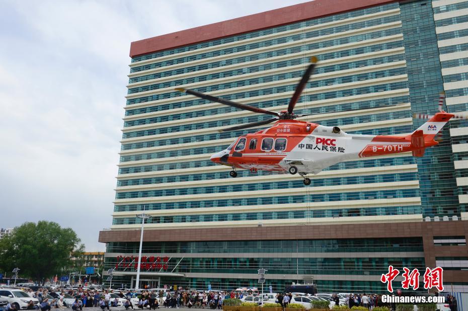 6月12日,救援直升机在医院升空演练。当日,内蒙古自治区人民医院航空医疗救援基地举行启动仪式。 中新社记者 刘文华 摄