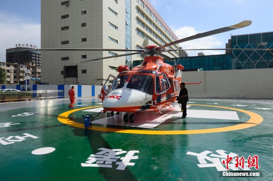 6月12日,救援直升机在医院的停机坪上维护。当日,内蒙古自治区人民医院航空医疗救援基地举行启动仪式。 中新社记者 刘文华 摄