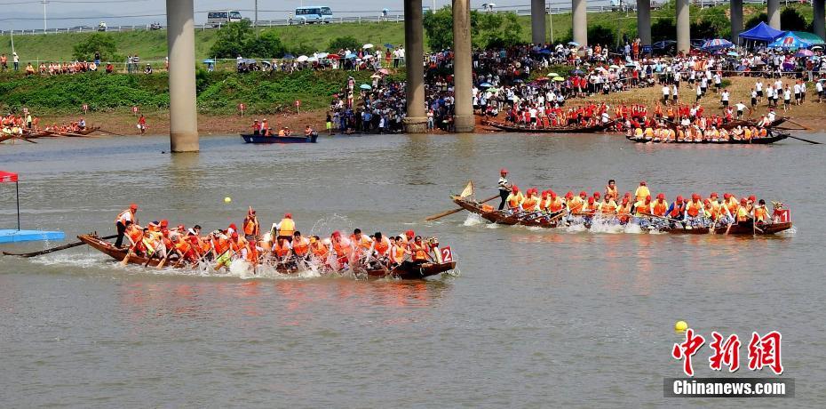 6月14日,龙舟队伍在江西南昌市新建区松湖镇锦江之上竞渡迎端午。当日是农历五月初一,南昌市新建区松湖镇举行划龙舟活动,该镇有农历五月初一至初五划龙舟迎端午的习俗,乡亲们都要通过划龙舟来祈求风调雨顺,国泰民安。陈斌 摄