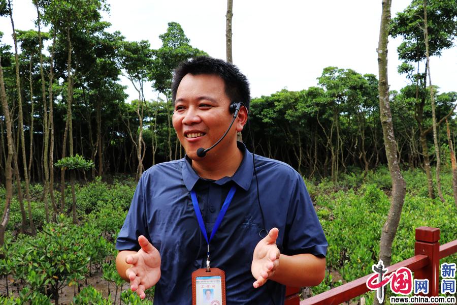 海南东寨港国家级自然保护区管理局助理工程师冯尔辉为记者介绍红树林的情况。中国网记者 唐佳蕾/摄