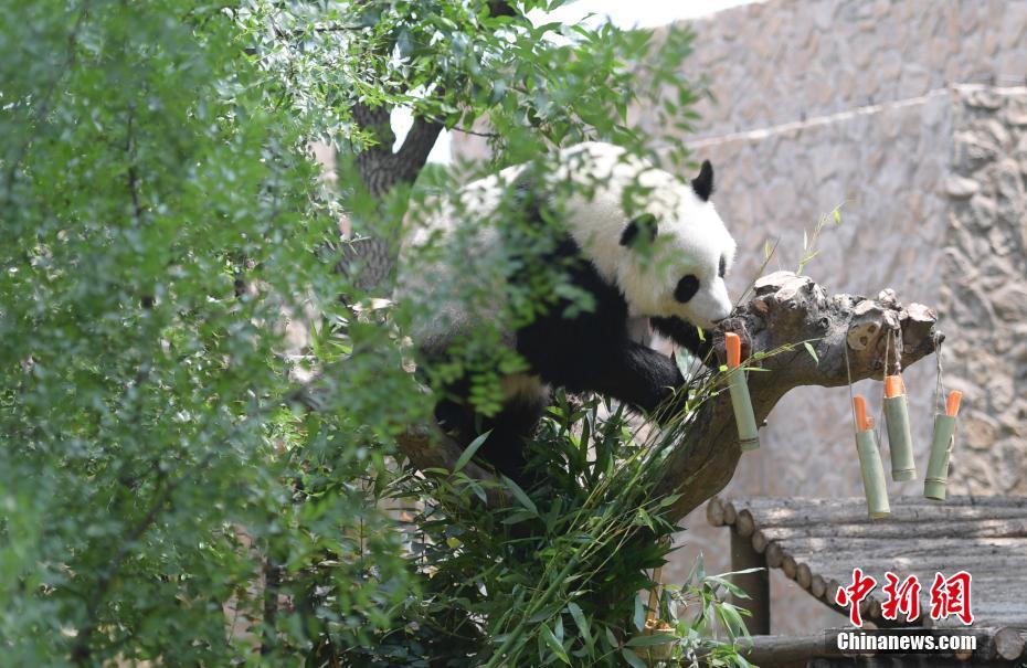 动物园里迎端午 大熊猫爬上爬下吃“粽子”