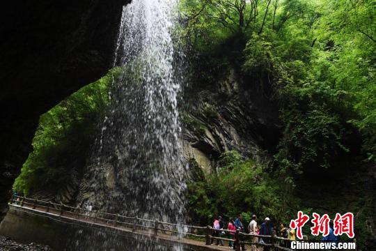 游客在瀑布下拍照留念。 杨艳敏 摄
