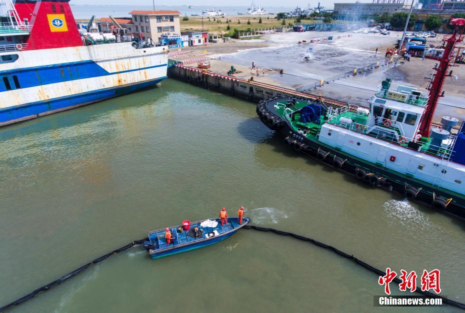 6月20日,2018海口港危险品码头船岸应急联合演习在海南唯一的危险品码头——海口港秀英作业区危险品码头举行,据了解,此次演习模拟海口港秀英作业区危险品码头滚装船舶作业时,装船车辆发生柴油泄漏和码头危险品车辆发生乙二醇泄漏、燃烧事故。图为航拍应急联合演习现场,工作人员对“泄漏柴油”设置围油栏、收油操作。中新社记者 骆云飞 摄