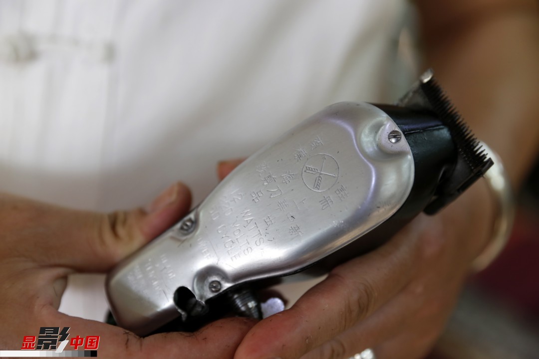 图为娄保民师傅在展示他用了几十年的电推子。新华网 姜冰摄