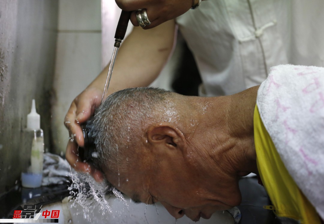 图为孔雀理发店理发师为顾客洗头。新华网 姜冰摄