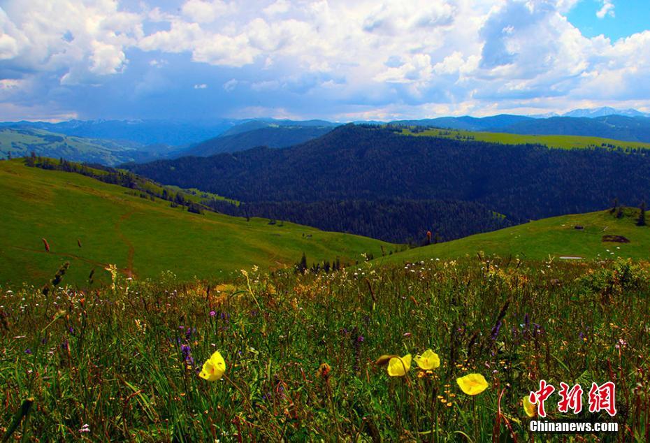 哈巴河县那仁夏牧场绿草如茵,花开遍野。文/谢师民 图/邓晓荣