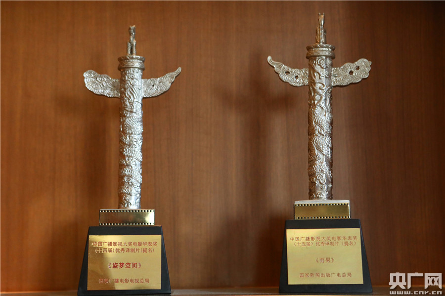 制作精良的作品也缕缕获得专业肯定,图为连续两年获得华表奖优秀译制片提名奖杯。(记者 张凯航)