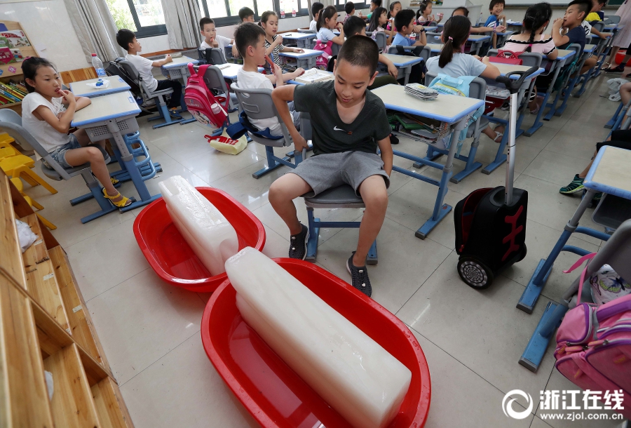 6月26日,杭州高新实验学校将冰块放入教室,一箱箱冒着凉气的冰块带来舒适凉意,让孩子们顺利度过高温时段。当日15时35分,杭州气温达到36.6℃,杭州市气象台发布高温橙色预警。(浙江在线记者 林云龙 摄)