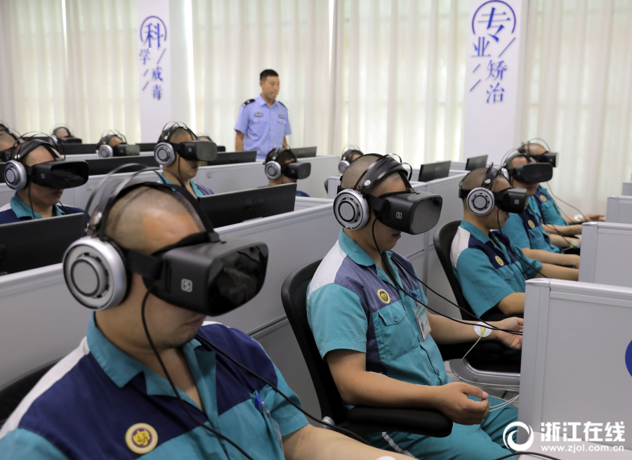 6月26日,浙江拱宸强制隔离戒毒所内,戒毒人员通过脑电技术和VR技术辅助戒毒。这些黑科技可以让戒毒人员身临其境地体会到吸毒的危害,从心理上减弱对毒品的依赖。(浙江在线记者 钱璐斌 徐文迪 摄)