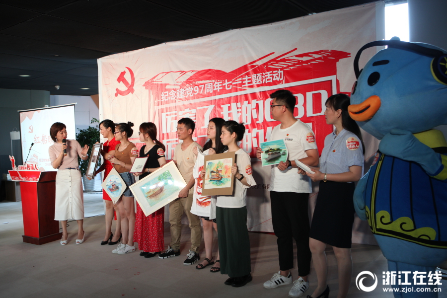 青年党员朋友们拿着自己的“红船”主题作品分享自己对新时代红船精神的理解。6月29日,杭州江干区四季青街道钱江新城CBD党委,为纪念建党97周年在钱江新城城市阳台开展开放式组织生活。钱江新城CBD各单位党委支部以及22个基层支部共120余名党员朋友们在“话红船”环节,通过交流、演讲等形式分享自己对新时代红船精神的理解。“画红船”则让大家拿起画笔,共画一艘船,领略红色革命情怀。(浙江在线记者 姚群 石怡锋 拍友 郭柳含 摄)
