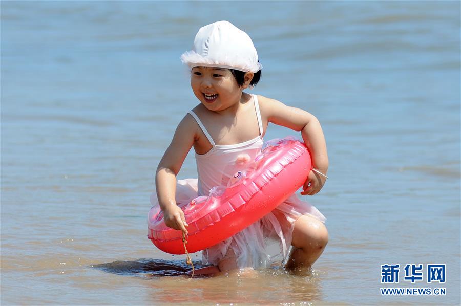 7月1日,一名小朋友在山东省青岛市第一海水浴场戏水。 新华社发(王海滨 摄)