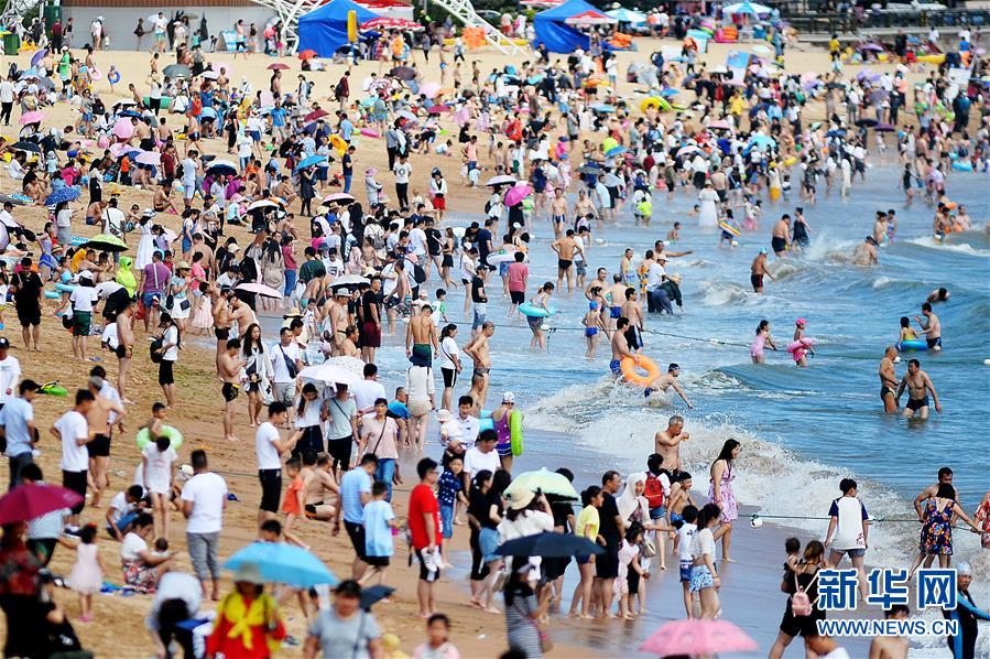 7月1日,游客在山东省青岛市第一海水浴场戏水。 新华社发(王海滨 摄)