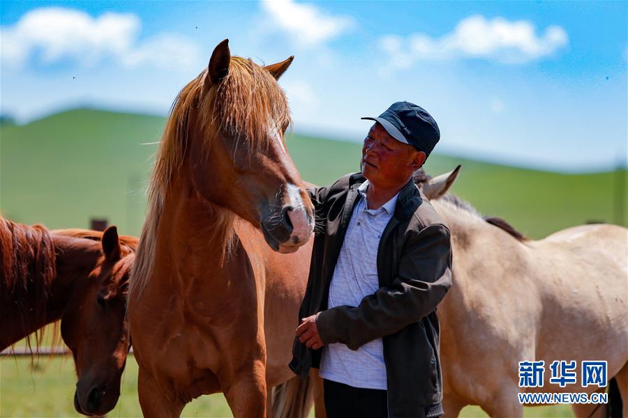 6月30日,在内蒙古赤峰市克什克腾旗小红山子嘎查的草原上,张福军在抚摸马匹。内蒙古赤峰市克什克腾旗小红山子嘎查村民张福军2015年在工地打工时不慎受伤,虽然手术顺利,但之后无法从事重体力劳动。10多万元的手术费让这个原本就不富裕的家庭陷入贫困。在村委会的帮助下,张福军养起了“旅游马”。每当旅游季到来时,他便牵着自家的马匹前往附近的跑马场供游人骑乘。在2年多的时间里,他通过饲养4匹马还清了之前治病欠下的债款,于2017年底成功脱贫。据悉,贫困户养殖“旅游马”是克什克腾旗推行“旅游+扶贫”模式中的一部分,当地以多处景区为重点,为周边嘎查(村)的贫困人口提供就业机会。据统计,2017年全旗共有6526名贫困人口从旅游业发展中受益。新华社记者 虞东升 摄