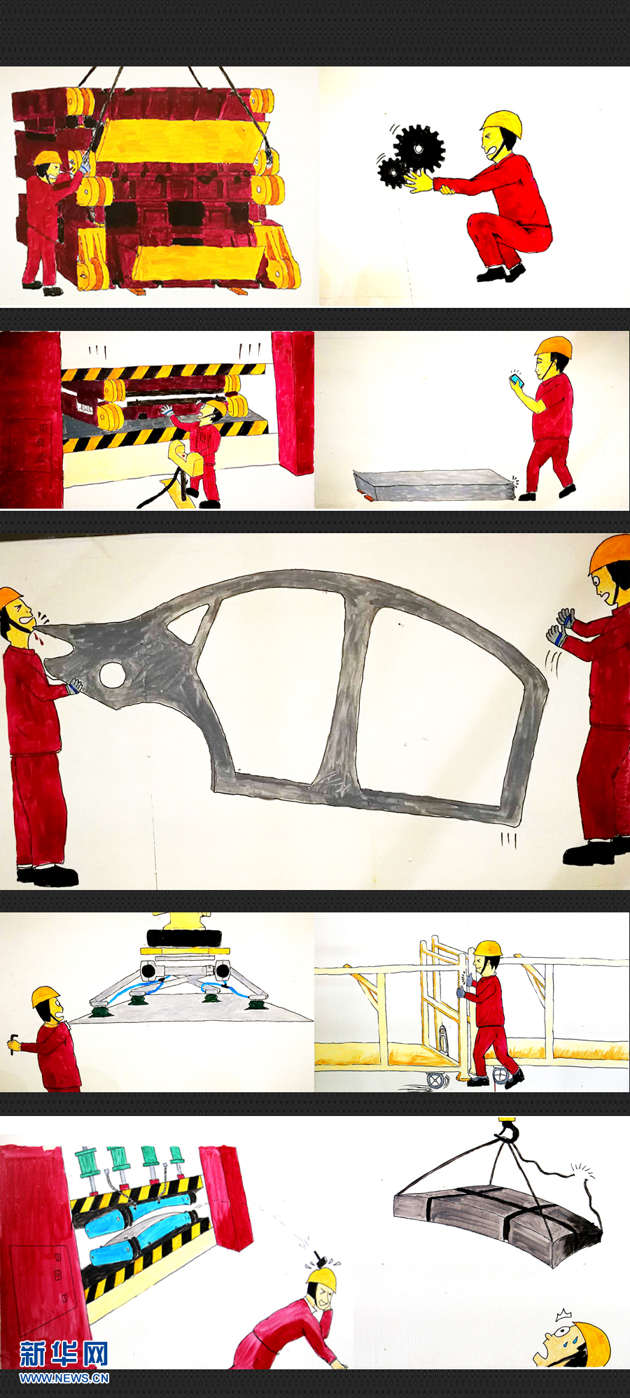 图为江淮乘用车冲焊车间有关安全生产的手绘图,用漫画形式生动表现生产生活中各种典型事故案例,对企业员工起到警示作用。 新华网 张明宇 摄