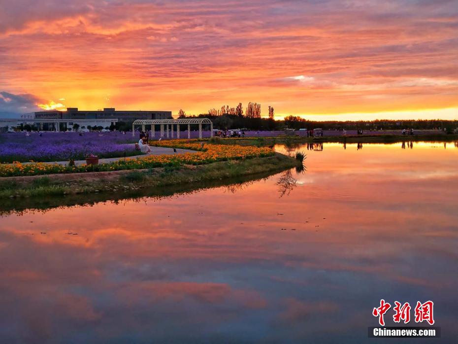 甘肃金昌雨后现“火烧云” 戈壁水天一片红
