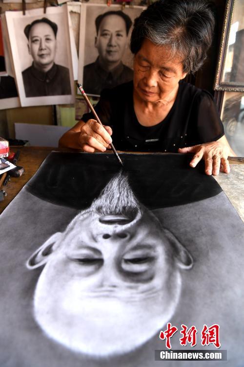 图为位于漳州古城里的南燕画室林慧燕佝偻着身子在桌子前作炭精画。其曾祖父、祖父、父亲,都是漳州早期的画师,到她这里已是第四代了。作为老民间艺术,炭精画以炭精粉为颜料,它源于国画,又区别于国画,其独特的块面干粉揉色运笔方法又不完全类同于素描,在表现形式上打破了素描所具有的那种线条排铺明暗调子。 张斌 摄