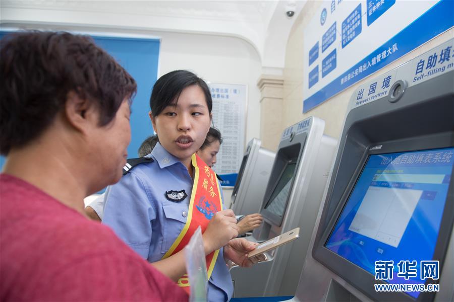 7月3日,在浙江省青田县公安局出入境办证中心,工作人员协助欲前往捷克探亲的侨眷办理出入境自助填表。