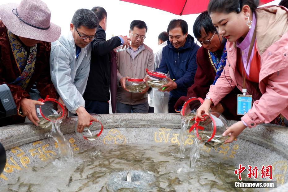7月3日,第十一届青海湖裸鲤增殖放流暨观鱼放生节,在中国最大咸水湖青海湖畔的海北藏族自治州刚察县举行。当地藏族民众及外地游客,将人工培育的100万尾湟鱼苗种,放流到青海湖主要注水河沙柳河中。图为民众将裸鲤苗种进行放流。中新社记者 李隽 摄