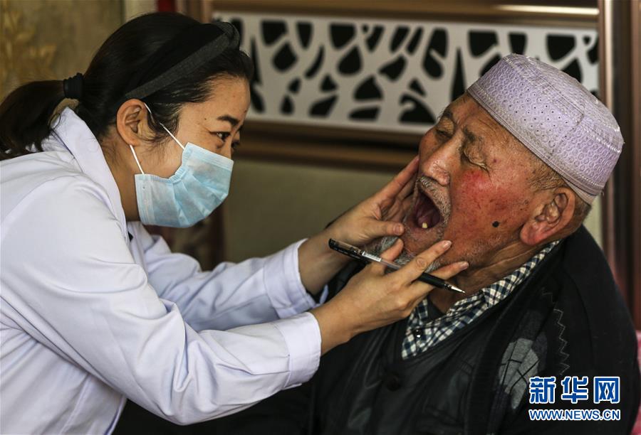 在新疆乌鲁木齐市米东区柏杨河乡居民叶赛尼·巴哈斯(右)家中,乡卫生院医生在为他检查口腔(2月2日摄)。叶赛尼·巴哈斯因腿疾出门不便,当地医务人员携带仪器上门为他体检。第二次中央新疆工作座谈会以来,特别是党的十九大召开以来,新疆坚决贯彻党中央关于新疆工作的大政方针,围绕社会稳定和长治久安总目标,加快经济发展和民生改善,促进民族团结和社会和谐,天山南北呈现安居乐业的良好局面。新华社记者 王菲 摄