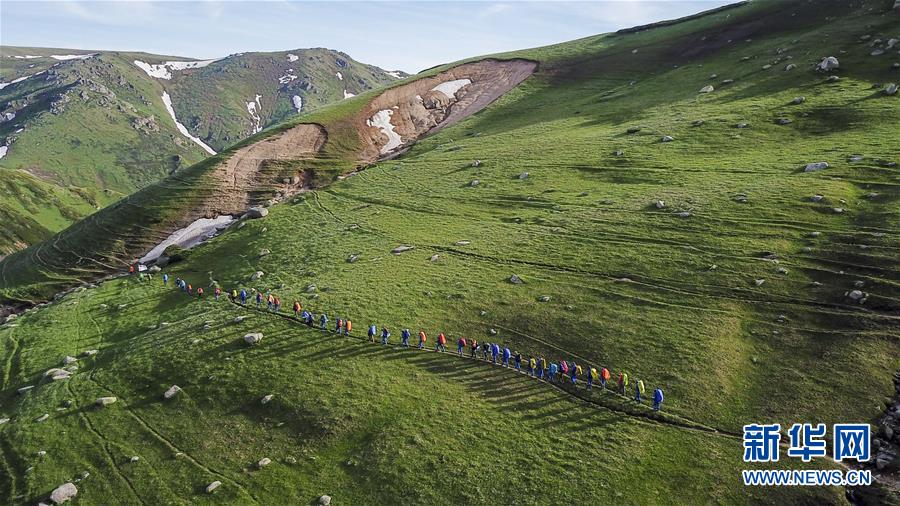 户外运动爱好者在新疆塔城地区额敏县的一处山区古道上徒步越野(6月16日无人机拍摄)。第二次中央新疆工作座谈会以来,特别是党的十九大召开以来,新疆坚决贯彻党中央关于新疆工作的大政方针,围绕社会稳定和长治久安总目标,加快经济发展和民生改善,促进民族团结和社会和谐,天山南北呈现安居乐业的良好局面。新华社记者 胡虎虎 摄
