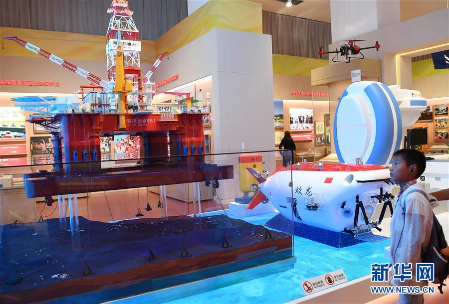 7月3日,观众参观“海洋石油981”钻井平台模型。 “复兴之路”大型主题展览丰富充实工作日前完成,新时代部分《不忘初心 砥砺奋进不断开创新时代中国特色社会主义事业新局面》1日在北京国家博物馆开展,7月3日起正式向公众开放参观。 新华社记者金良快摄