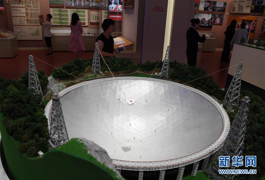 7月3日,观众参观500米口径球面射电望远镜模型。 “复兴之路”大型主题展览丰富充实工作日前完成,新时代部分《不忘初心 砥砺奋进不断开创新时代中国特色社会主义事业新局面》1日在北京国家博物馆开展,7月3日起正式向公众开放参观。 新华社记者金良快摄