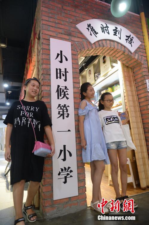 7月4日,小朋友在店内合影。近日,内蒙古呼和浩特一商场内的怀旧“小卖部”吸引不少顾客,该销售怀旧零食、FC游戏机、旧二八自行车等物品,引来不少市民光顾。中新社记者 刘文华 摄
