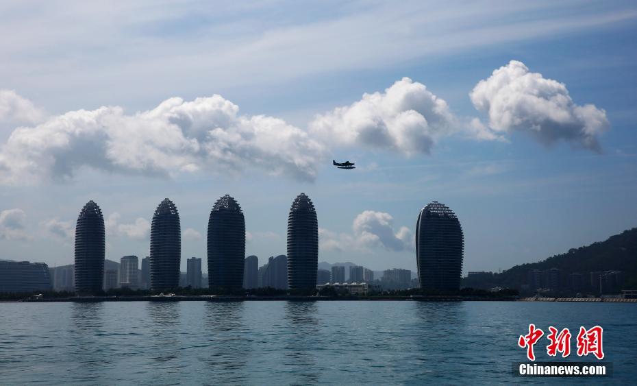 7月4日,三亚市2018年海上防污染综合应急演习在三亚湾水域举行。演习调动了琼南地区最强的应急处置专业和社会力量参加,其中包括三亚海事局、三亚市政府应急办、安监、交通、海洋、消防、救助、清污单位等单位共100余人、12艘船舶和1架水上飞机,他们就事故接警响应、船舶消防灭火、人员搜寻救助、海上溢油围控、溢油污染清除等五个应急处置科目进行演练。这是三亚首次举办海陆空联动海上防污染综合应急演习。图为水上飞机在海面低空盘旋搜救落水人员。中新社记者 王晓斌 摄