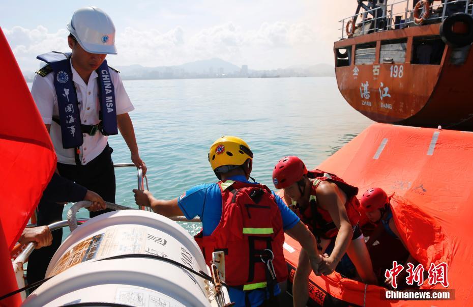 7月4日,三亚市2018年海上防污染综合应急演习在三亚湾水域举行。演习调动了琼南地区最强的应急处置专业和社会力量参加,其中包括三亚海事局、三亚市政府应急办、安监、交通、海洋、消防、救助、清污单位等单位共100余人、12艘船舶和1架水上飞机,他们就事故接警响应、船舶消防灭火、人员搜寻救助、海上溢油围控、溢油污染清除等五个应急处置科目进行演练。这是三亚首次举办海陆空联动海上防污染综合应急演习。图为演习中,逃生人员获得救助。中新社记者 王晓斌 摄
