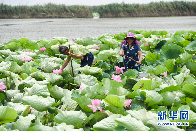 6月27日,在泗洪县半城镇穆墩岛村辖区内的水上生态牧场,渔民在进行日常管理。 2017年以来,江苏省泗洪县在城头乡、半城镇等乡镇实施“水上生态牧场”项目,利用退围还湿水域,在宜植(殖)水体种植经济植物、养殖经济鱼类。目前,该县共建设“水上生态牧场”8.26万亩。“一水多用、鱼菜共生、生态高效”的新型综合种养模式,有效推动泗洪县渔业结构调整,实现生态保护和经济发展和谐统一。新华社记者 季春鹏 摄