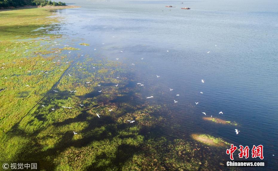 鄱阳湖水涨起,白鹭在水草间飞舞。 傅建斌 摄 图片来源:视觉中国
