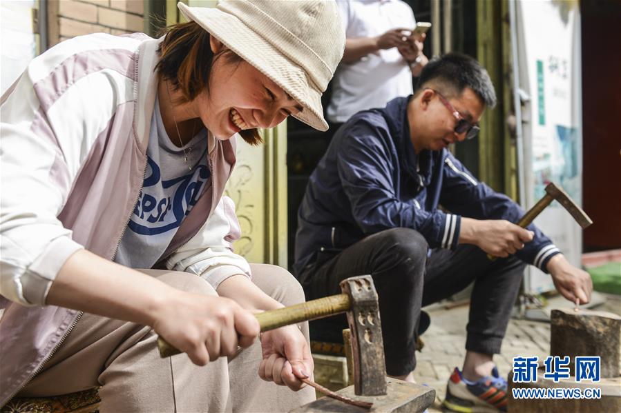 游客唐巧(左)在喀什老城一户参与“石榴籽计划”体验游项目的铜匠铺门口学习打制铜手镯(5月26日摄)。今年夏天,深圳对口援疆前方指挥部与喀什市共同发起“石榴籽计划”体验式旅游项目,国内外游客可跟随当地手工艺匠人学习制作陶器、铜器、木器;在乐器店欣赏原汁原味的民俗歌舞;自助烤馕、免费品茶;还能走进老城居民家中吃“碰饭”。新华社记者 马锴 摄