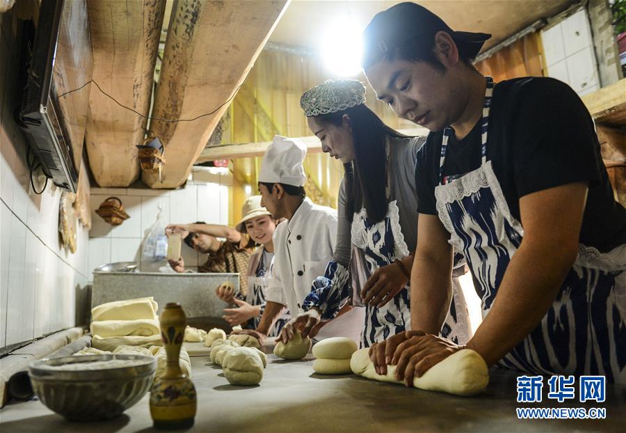 在喀什老城一户参与“石榴籽计划”体验游项目的烤馕店里,游客柳森琪(右一)在学习制作馕饼(5月26日摄)。今年夏天,深圳对口援疆前方指挥部与喀什市共同发起“石榴籽计划”体验式旅游项目,国内外游客可跟随当地手工艺匠人学习制作陶器、铜器、木器;在乐器店欣赏原汁原味的民俗歌舞;自助烤馕、免费品茶;还能走进老城居民家中吃“碰饭”。新华社记者 马锴 摄