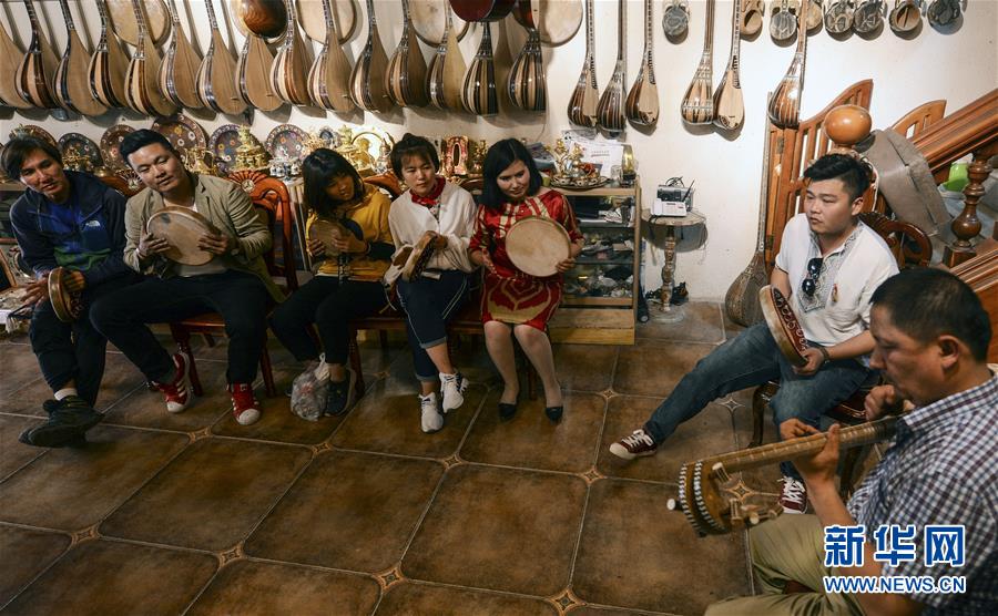 在喀什老城一间参与“石榴籽计划”体验游项目的乐器店中,游客一边欣赏店主演奏乐器一边试着用手鼓打节奏(5月18日摄)。今年夏天,深圳对口援疆前方指挥部与喀什市共同发起“石榴籽计划”体验式旅游项目,国内外游客可跟随当地手工艺匠人学习制作陶器、铜器、木器;在乐器店欣赏原汁原味的民俗歌舞;自助烤馕、免费品茶;还能走进老城居民家中吃“碰饭”。新华社记者 马锴 摄