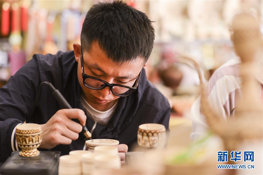 在喀什老城一户参与“石榴籽计划”体验游项目的木器店中,游客李金徽体验在木器上烫印花纹(5月26日摄)。今年夏天,深圳对口援疆前方指挥部与喀什市共同发起“石榴籽计划”体验式旅游项目,国内外游客可跟随当地手工艺匠人学习制作陶器、铜器、木器;在乐器店欣赏原汁原味的民俗歌舞;自助烤馕、免费品茶;还能走进老城居民家中吃“碰饭”。新华社记者 马锴 摄