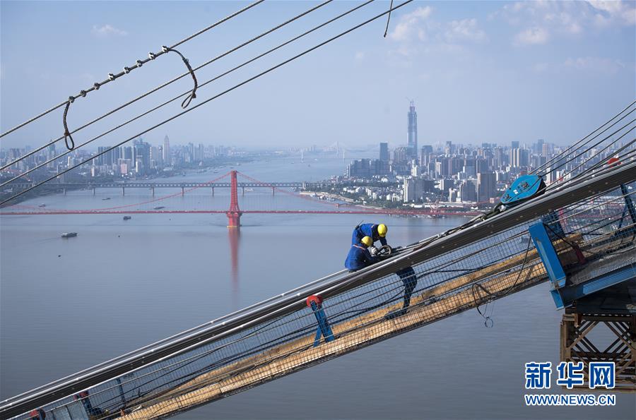 来自四川泸州的34岁工人刘能(右)与工友在高空作业(6月25日摄)。他们的后方依次是鹦鹉洲长江大桥、武汉长江大桥、武汉长江二桥和武汉二七长江大桥。新华社记者肖艺九摄