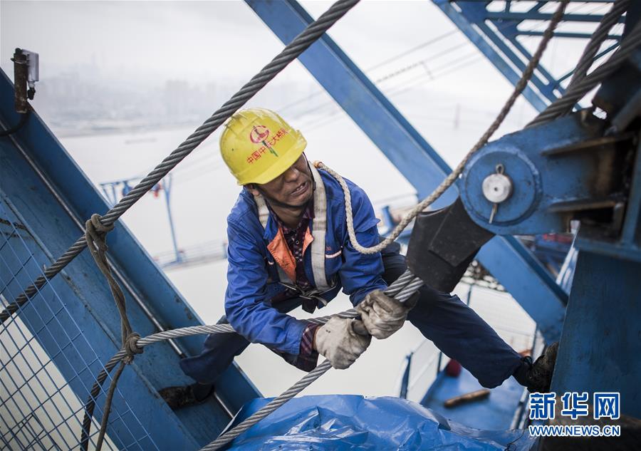 50岁的杨仍财在架设主缆(6月8日摄)。新华社记者肖艺九摄