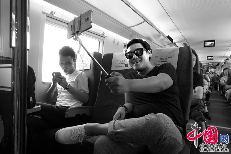 2015年,上海——杭州东。一位男士用支架架起手机娱乐。王福春摄影