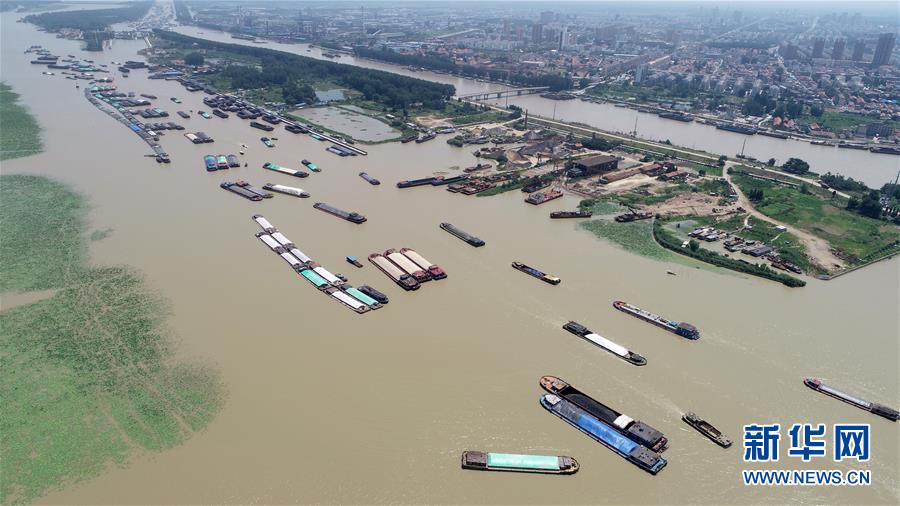 7月13日,船舶行驶在洪泽湖水面上(无人机拍摄)。当日,随着台风“玛莉亚”影响减弱,江苏淮安洪泽区地方海事处对洪泽湖解除封航。 新华社发(张建 摄)