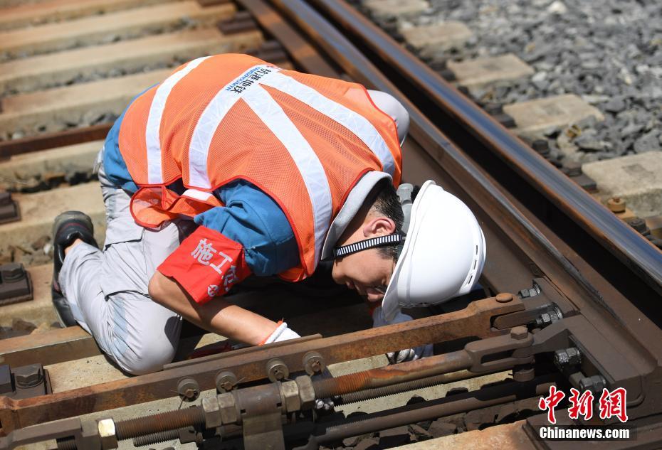 7月16日,一名技术员正在加固轨道转辙机零件。当日,在浙江杭州36℃高温天气下,杭港地铁的“90后”信号检修团队头顶烈日,对轨道转辙机与信号系统进行常规检修,保障列车安全高效运行。中新社记者 王刚 摄