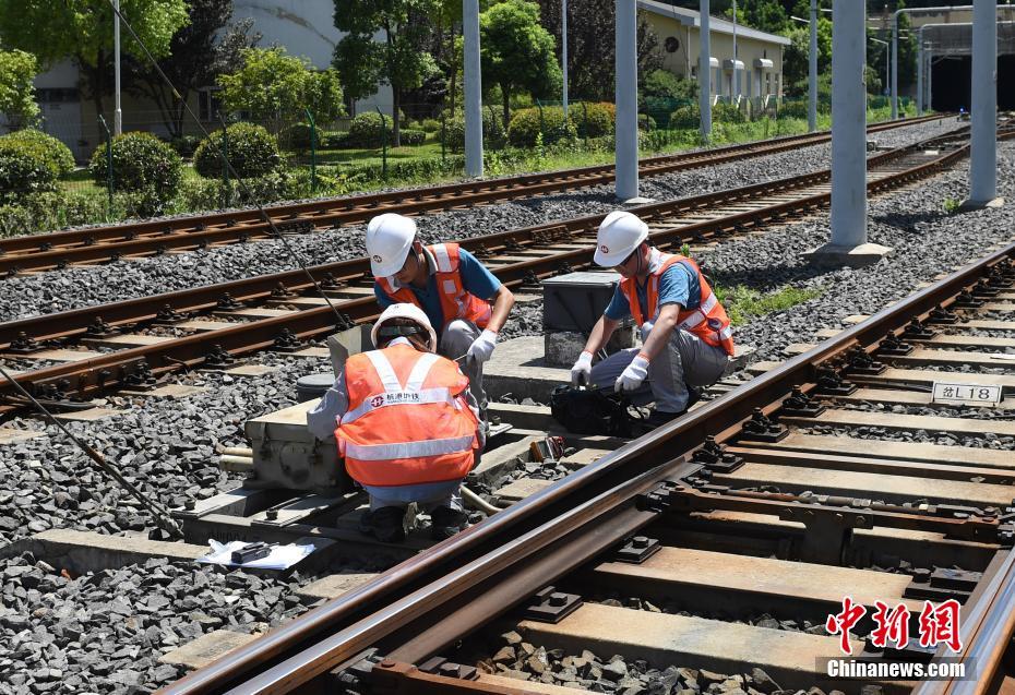 7月16日,三名信号检修工作人员正在地铁轨道上进行检修。当日,在浙江杭州36℃高温天气下,杭港地铁的“90后”信号检修团队头顶烈日,对轨道转辙机与信号系统进行常规检修,保障列车安全高效运行。中新社记者 王刚 摄